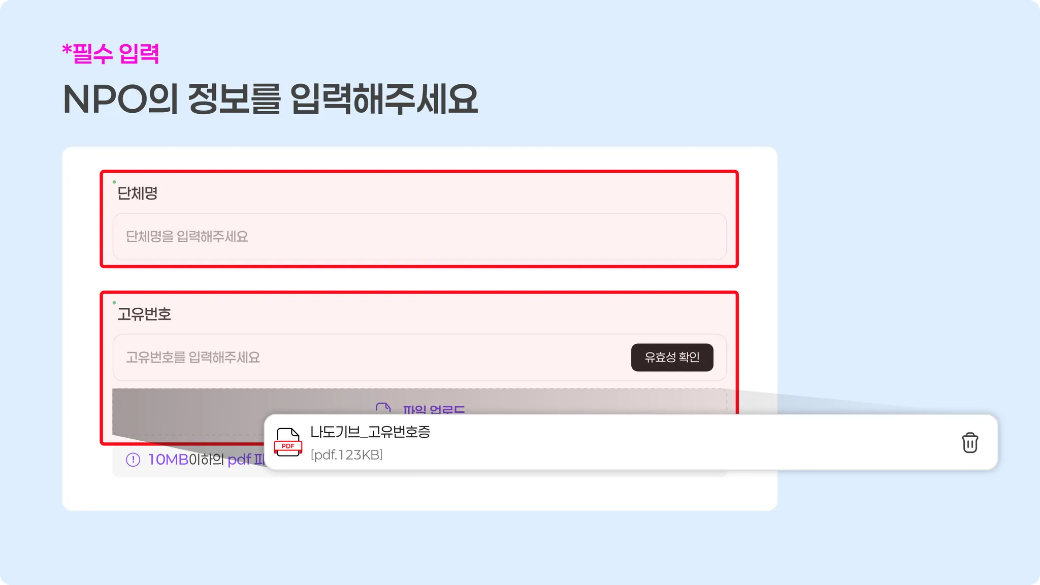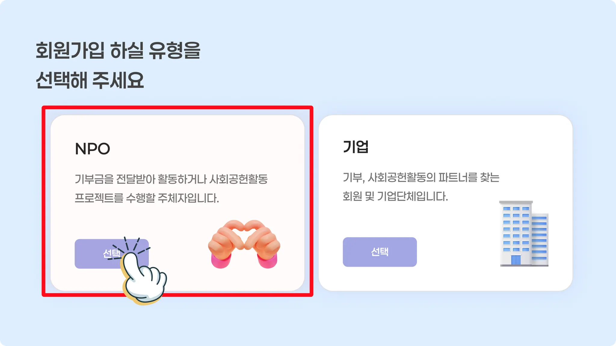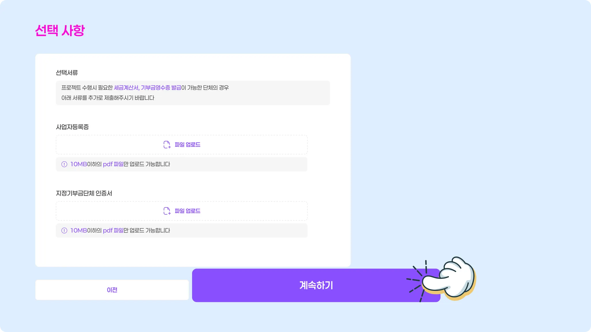 사업자등록증과 지정기부금단체 인증서는 선택서류이고, 가입 이후에 마이페이지에서