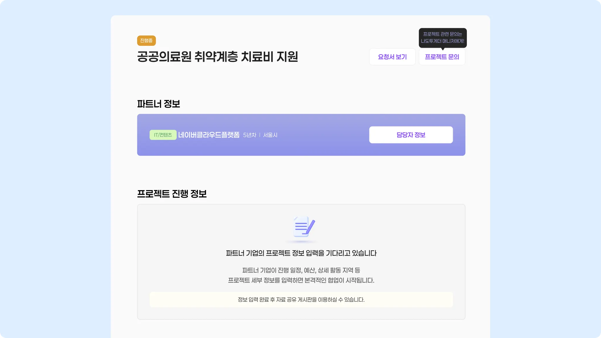 해당 화면에서 기업 회원이 사회공헌 수행 파트너를 찾고 있는 프로젝트 상세 내용을
