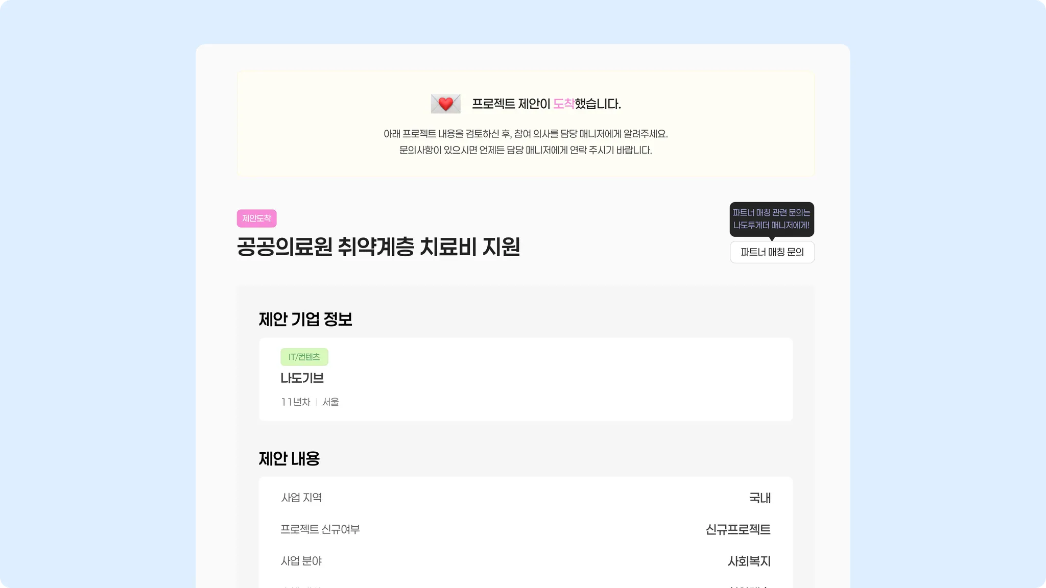 기업이 사회공헌 프로젝트를 함께할 NPO 파트너 매칭을 요청한 프로젝트 건에 대해