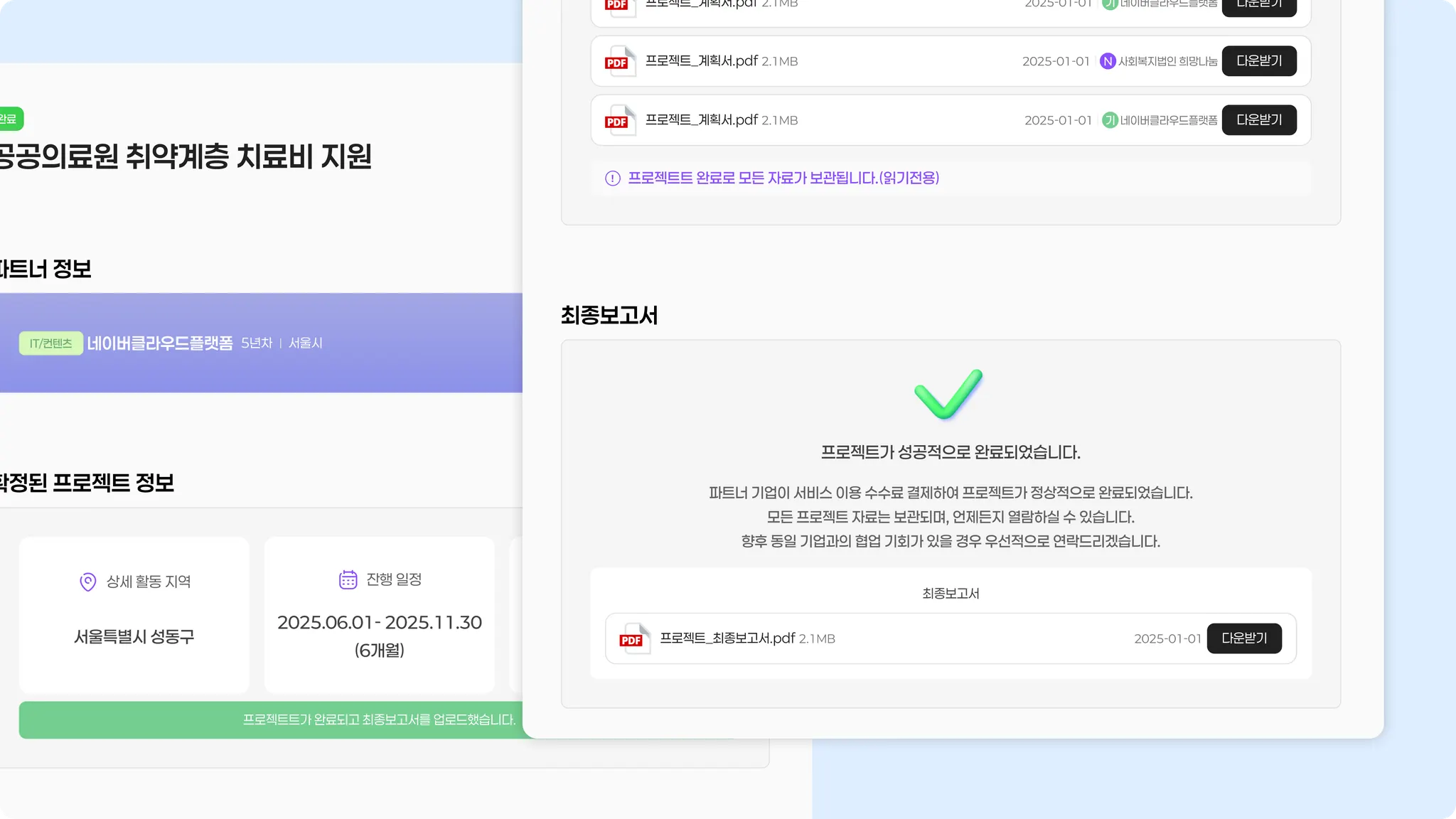 기업 회원이 최종보고서 열람을 완료한 화면입니다.