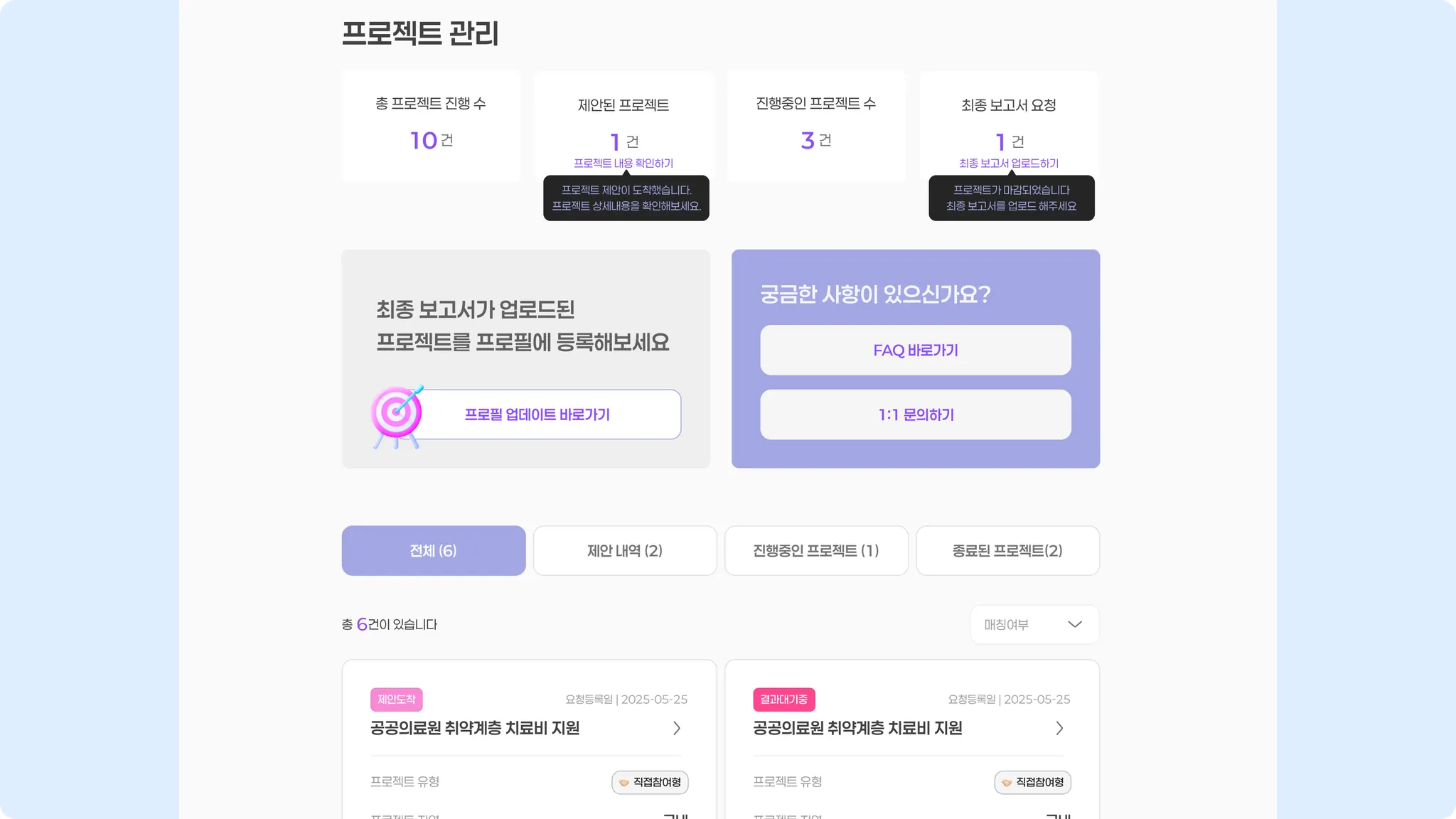 프로젝트를 확인하시려면 화면 상단에 프로필 [프로젝트 관리]에서 확인 가능합니다.
