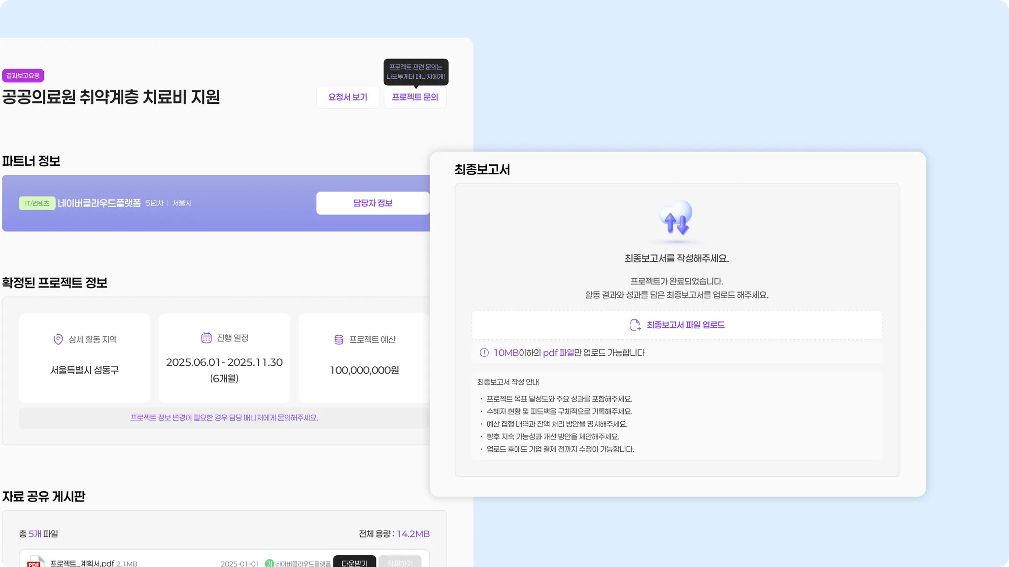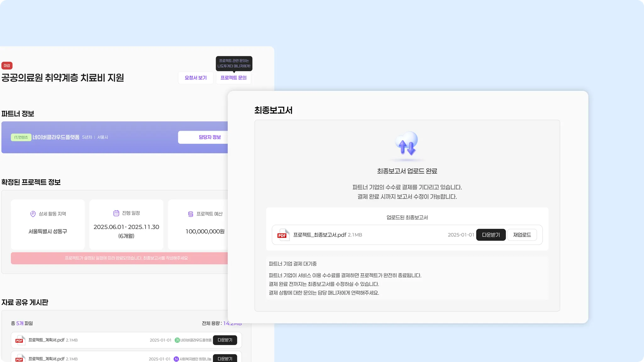 [최종보고서 파일 업로드] 버튼을 클릭하여 해당 프로젝트의 최종보고서 자료를