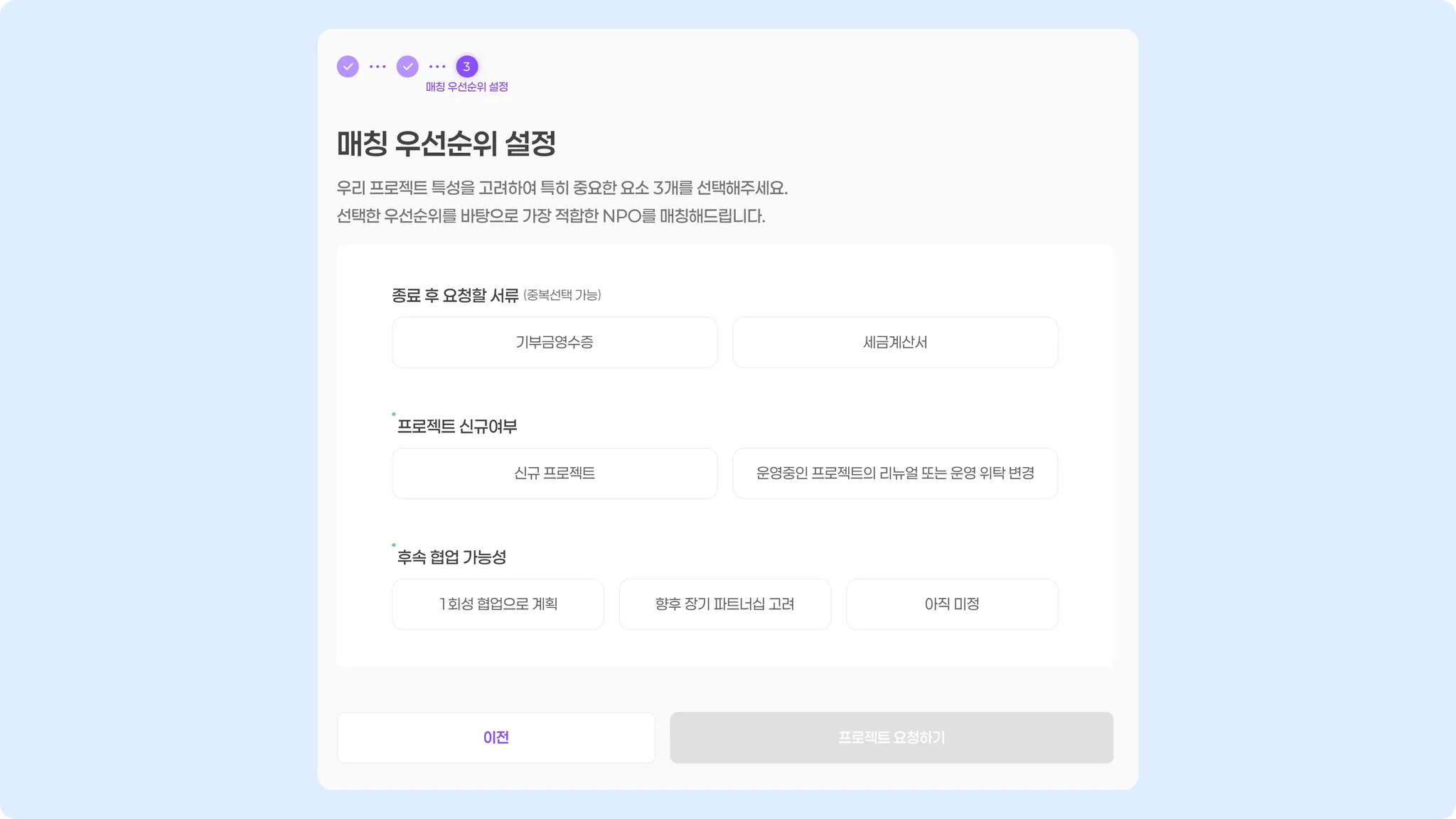 다음으로 최적의 비영리법인 파트너를 매칭하기 위한 상세 조건을 선태해주세요.