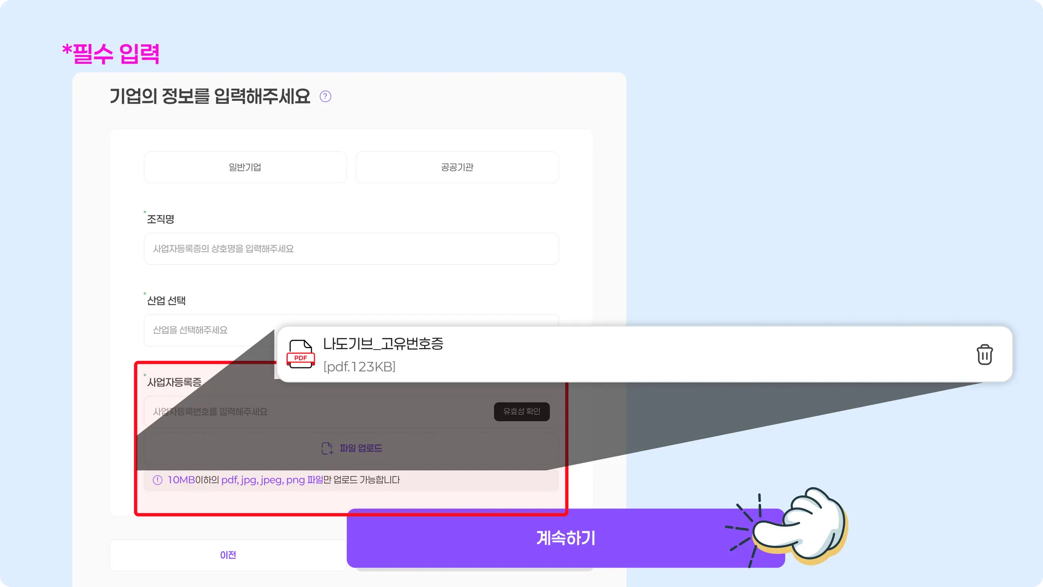 파일 업로드 버튼을 클릭하여 유효한 사업자등록증 파일 선택 후 업로드합니다.